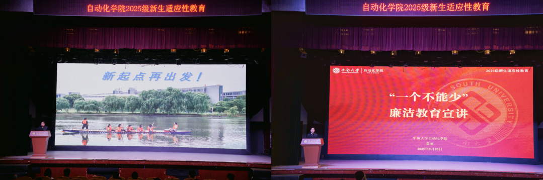 黄亚以“再出发——给2025级本科新生”为题向全体新生介绍了学院学工概况和校园文化建设、学风建设的重要举措。她勉励新生要向新出发,尽快适应大学校园生活,科学规划未来,实现全面发展。黄亚还对全体新生进行了廉洁教育宣讲,教育引导同学们要坚定理想信念,严守纪律规矩,勇于担当奋斗,扣正、扣牢、扣好“第一粒扣子”。