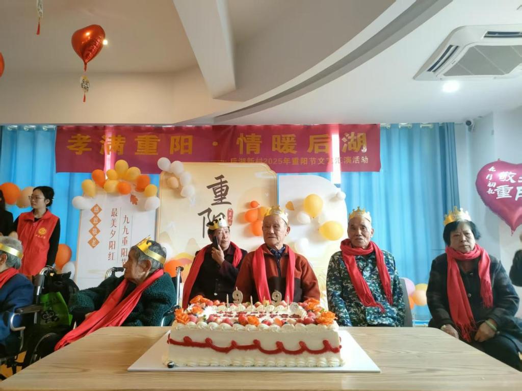 10月28日,志愿者们来到后湖居家养老服务站,进行节日场所布置。志愿者们分工协作,有序完成各项准备工作,将敬老爱老的传统美德融入到每一个布置细节之中。10月29日,志愿者们为老人们呈献了温馨、精彩的重阳敬老文艺汇演,同时悉心筹备了集体庆生环节,为老人们营造了温馨难忘的节日体验。