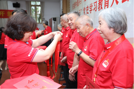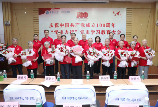 在欢快的《欢迎进行曲》中,桂卫华院士、王一军书记、阳春华经理、黄亚副书记为到会的10位老同志佩戴纪念章,送上慰问金,全体院领导为老同志献上鲜花。聚光灯下的鲜亮纪念章,是一辈辈老党员们披荆斩棘,筚路蓝缕,永担初心使命的闪光回答。