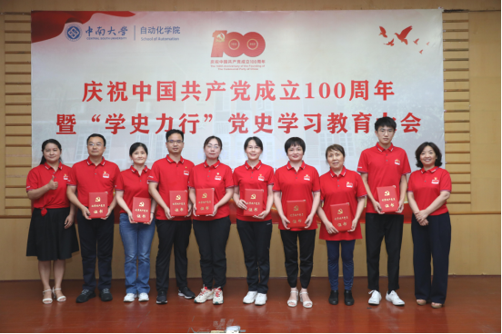 欢快的音乐再次响起。桂卫华院士、王一军书记、阳春华经理、黄亚副书记为来自教工支部、离退休支部和员工支部的8名优秀共产党员颁发荣誉证书。