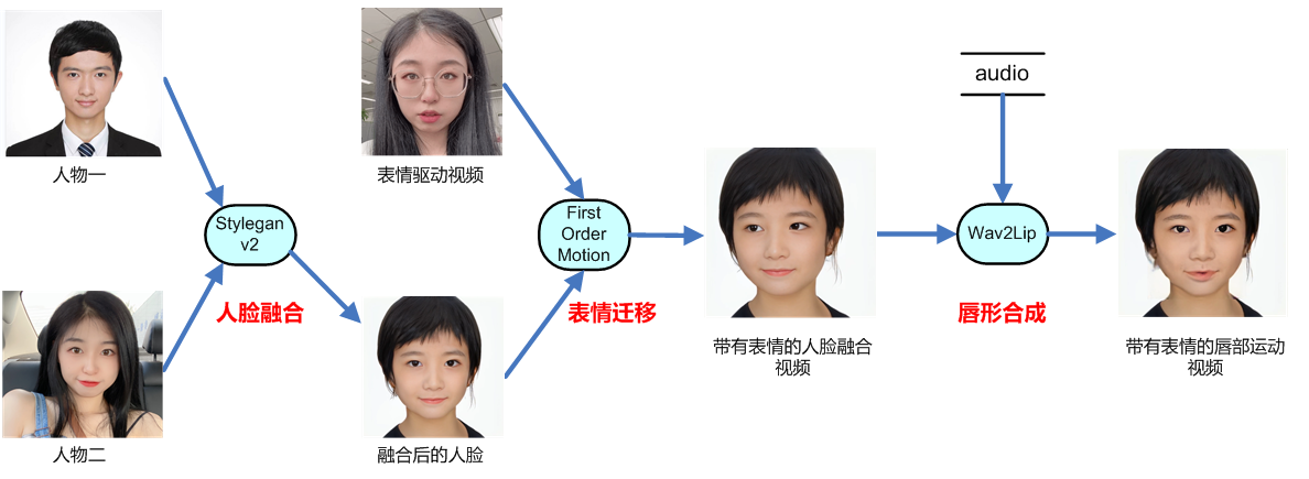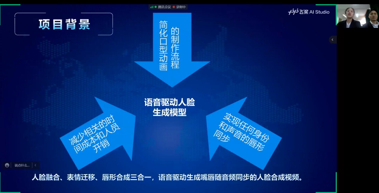 一等奖项目 “基于GAN的表情与唇形合成算法与实现”将人脸融合、表情迁移、唇形合成三种技术结合起来,通过导入语音音频来驱动生成嘴唇随音频同步的人脸合成视频,填充了大多数音频驱动的唇形合成视频里没有实时表情的空白。