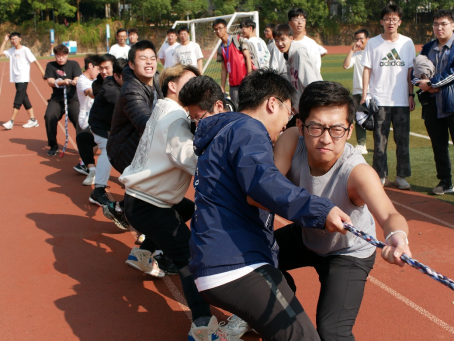 接下来进行的项目是拔河。拔河比赛由班级为单位组成参赛队伍,是各队伍间集体力量和策略的较量。一声哨音响起,长绳两边分别站立的10位队员双方立马卯足了劲抱紧绳子向后倾倒,喊着口号,咬紧牙关拼尽力气拉拽。赛后,尽管他们的双手被粗糙的绳子勒出一片红痕,额前满是汗水,脸上却洋溢着纯粹的快乐。