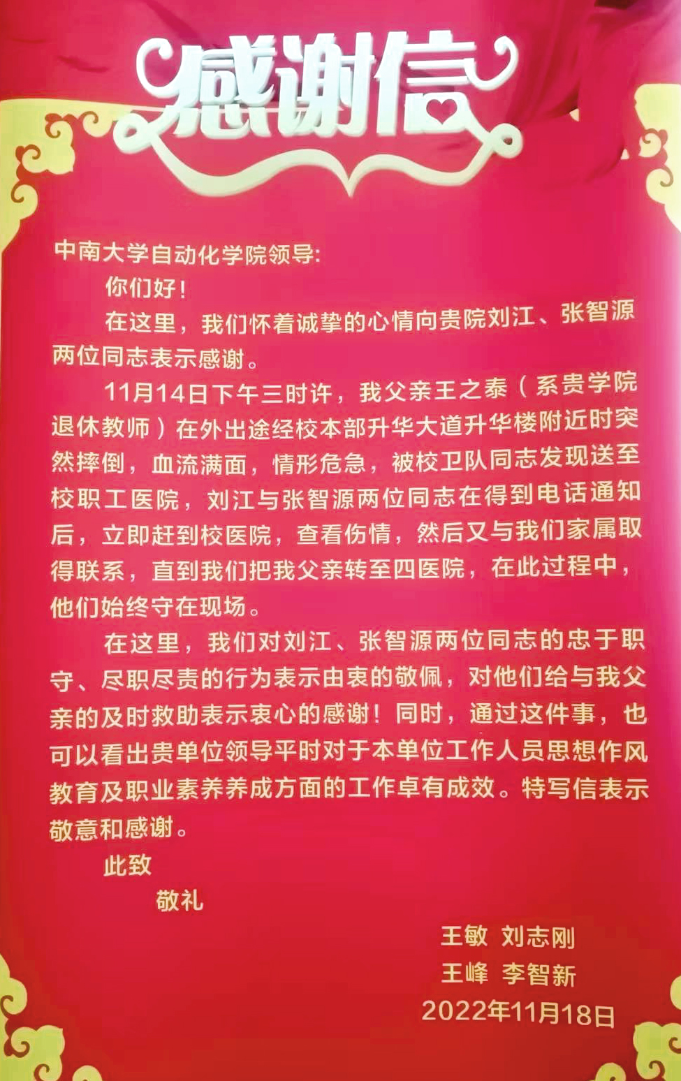 11月14日,退休教师王之泰在校本部升华楼附近不慎摔倒,情形十分危急。在接到校职工医院的电话后,负责离退休工作的刘江、张智源同志火速赶到校医院,了解伤情,并协助家属将老同志转送至市四医院。在此期间,刘江、张智源始终守在现场。