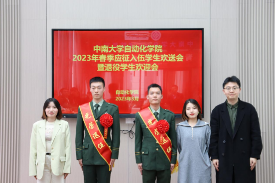 之后,黄亚副书记、刘乐老师为入伍同学佩戴绶带和大红花,朱家明老师、徐雪婷老师、赵勰老师为退役同学佩戴绶带和大红花,并合影留念。