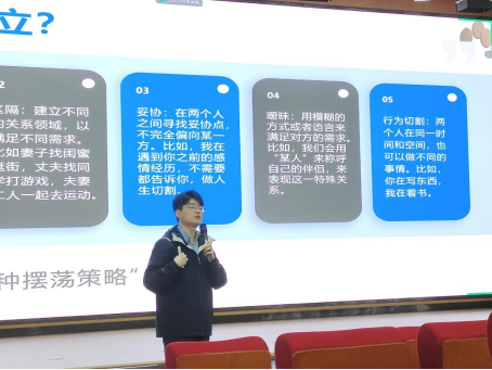 上午9:00,讲座准时开始。尚老师从爱情的角度入手,询问同学们对爱情的看法,紧接着便阐述了爱情的真正含义。他谈及爱情的进阶关系——俄狄浦斯期,将一段爱情从二元关系转变为三元关系,即将对方视为一个独立的人并减少以自我为中心的想法,发人深思。此外,尚老师还讲到了爱与性的内在关系,他说:“性不应只是身体问题,更是爱的关系问题”,让同学们重新审视爱与性之间的关联。现场气氛轻松活跃,同学们积极响应。