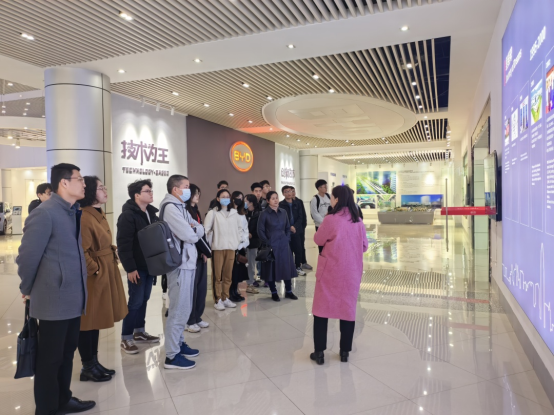 在比亚迪华中地区人力资源部蒋平经理的带领下,大家一起走进比亚迪展厅,了解比亚迪27年的发展历史,体会企业“技术为王,创新为本”的发展理念。在解说员介绍比亚迪刀片电池的超级安全性能时,同学们不禁啧啧赞叹。紧接着,大家在展厅体验比亚迪全系列汽车产品,同学们亲身感受不同类型比亚迪汽车的智能技术、外观性能、车内空间以及相关技术参数,现场讨论热烈。