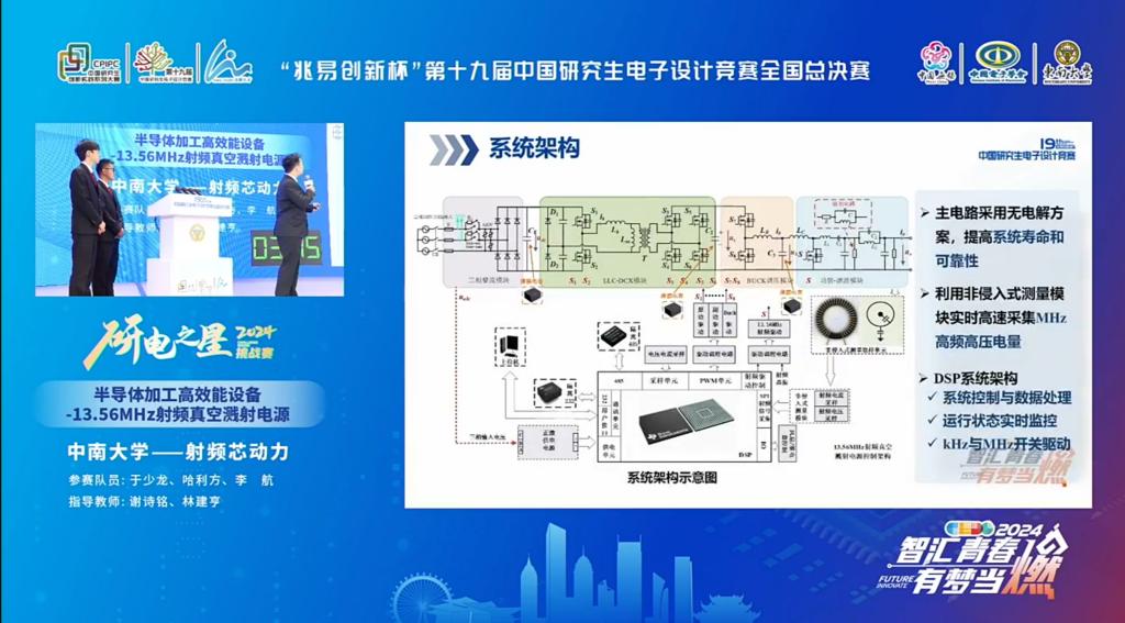 “射频芯动力”团队的参赛作品是一款面向半导体加工高效能设备的13.56Mhz射频真空溅射电源。该电源解决了现有国产射频电源电解电容方案可靠性低、高频高压功率测量困难以及等离子体负载本征弱阻尼振荡等问题,具有高精度与高可靠性等优势。作品在谢诗铭、林建亨两位老师指导下完成。团队队长于少龙同学在获奖后感言,经过方案设计、仿真验证、软硬件实现、产线测试与优化等作品研制过程和竞赛流程,大大提升了参赛队员团队协作能力以及电力电子控制等方面专业技能,锻炼了参赛队员理论结合实际能力。