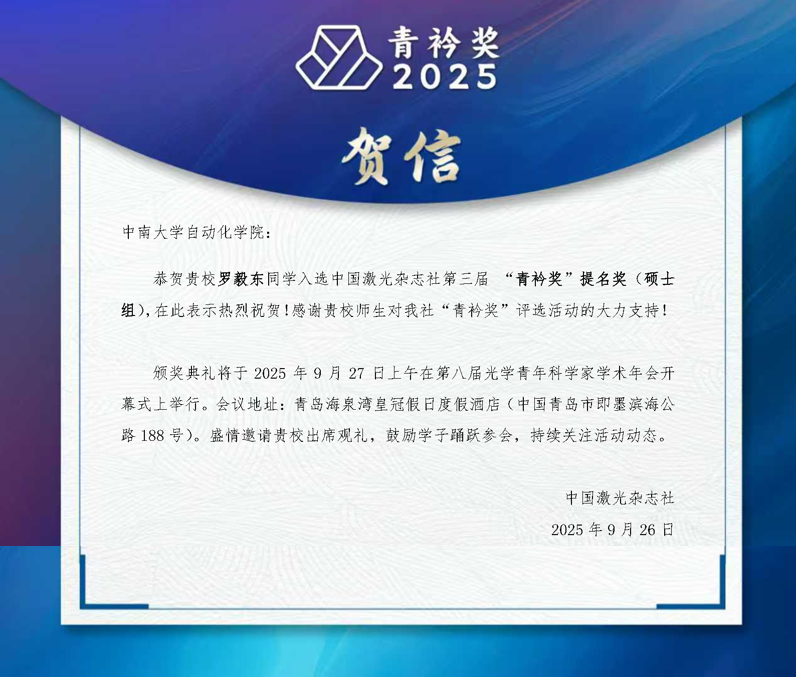 “青衿奖”由中国激光杂志社于2023年发起,旨在鼓励全球光学领域青年学子交流学术成果、激发创新思维,助力中国光学事业发展。中国激光杂志社是激光、光学、光子学领域的一流出版机构,本届评选吸引海内外众多高校及科研院所的研究生参与,共有12名研究生获“青衿奖”提名奖,罗毅东为其中唯一获提名奖的硕士研究生。