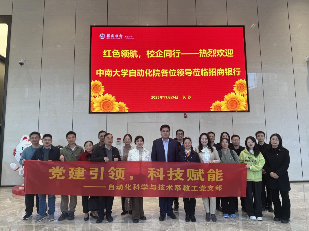 11月26日,自动化系教工党支部与招商银行大河西先导区支行党支部联合开展“红色领航,校企同行”支部共建主题党日活动,深入学习贯彻党的二十届四中全会精神,发挥基层党支部的战斗堡垒作用。两个支部党员赴新民学会旧址和招商银行长沙分行总部进行参观学习与科技交流,实现红色精神传承与前沿科技研讨的深度融合。