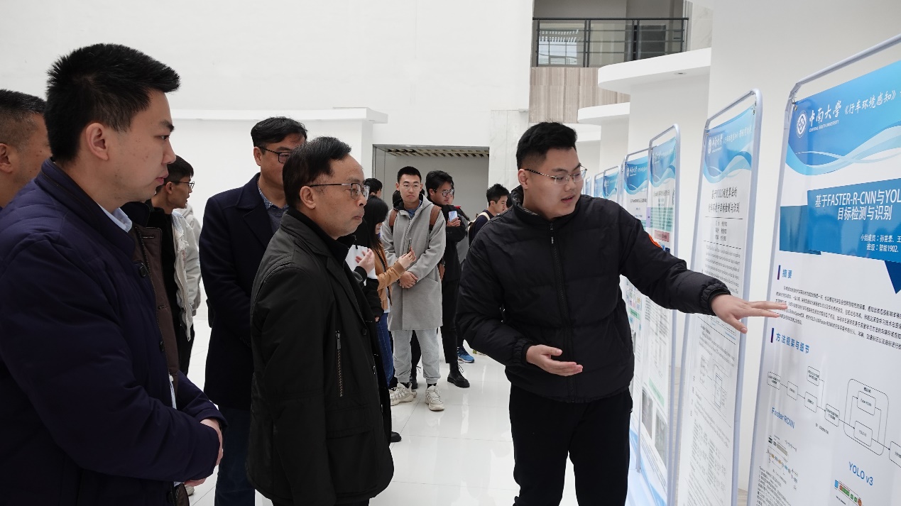 走进宽敞明亮的信息楼大厅,首先映入眼帘的是一列排开的湘江班同学们精心设计的海报。大家的海报或选题新颖,或排版精美,部分小组采用了纯英文的撰写方式,让前来参观的老师同学们眼前一亮。上午9时许,王经理带队对所有展板进行了巡视。在大家精心制作的海报前,所有小组的成员神采奕奕地为前来的老师和同学们进行讲解,自信地展示了自己小组的研究成果。王经理仔细聆听了每个项目的介绍,并做了细致的点评。巡展结束后,王经理高度评价了同学们做出的成绩,充分肯定了湘江班和行车环境感知课程的教改工作,并对同学们在人工智能领域的学习深造寄予了深切的期望和美好的祝福。